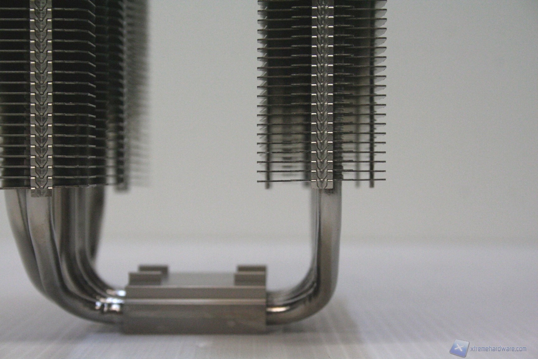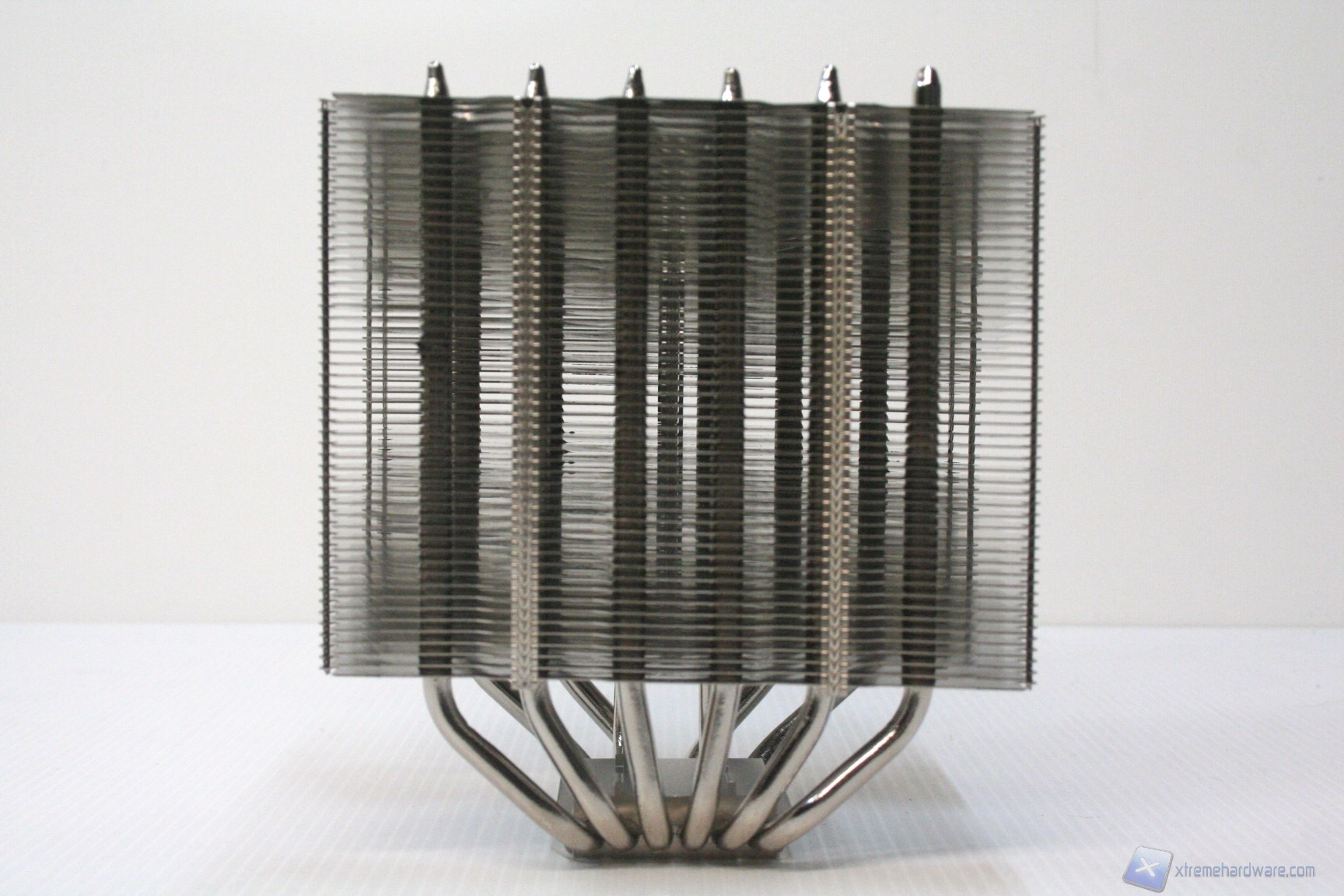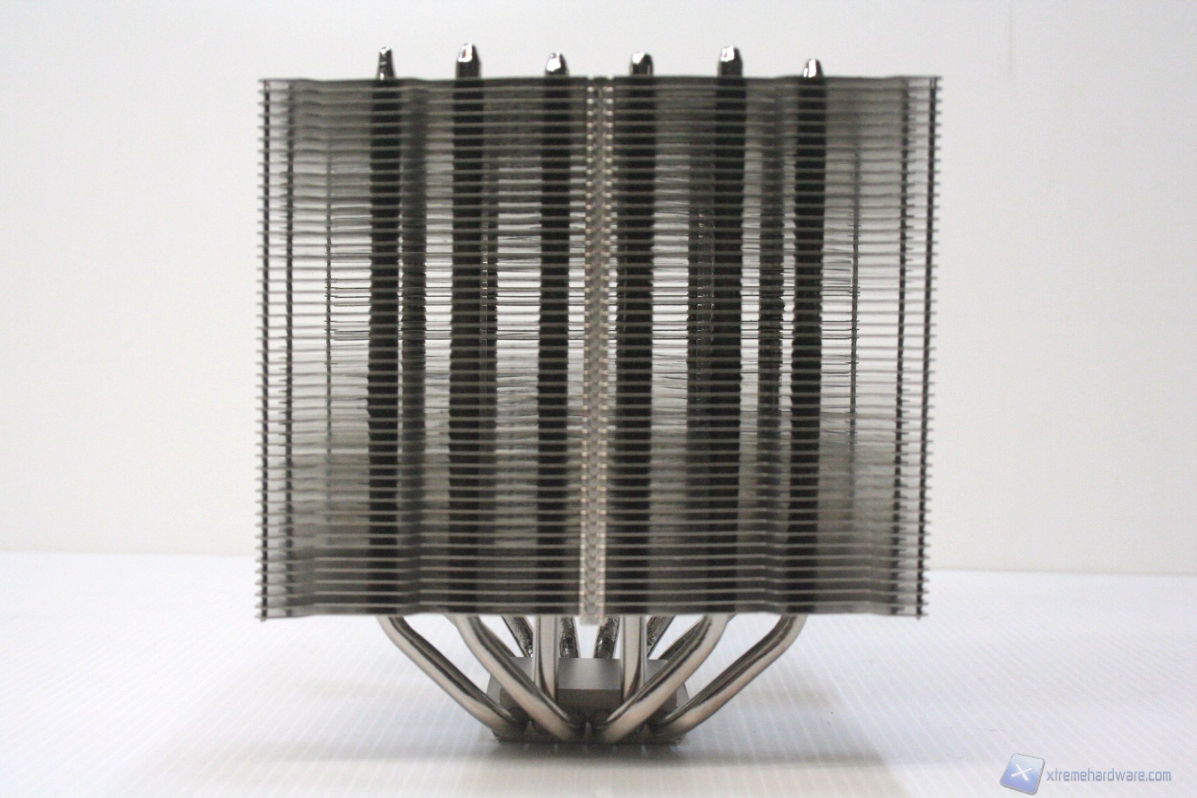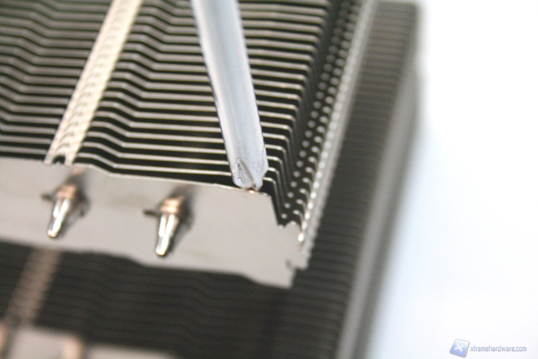La struttura del corpo dissipante è molto avanzata e in parte ci ricorda il Thermalright Archon, il che è tutto dire sul design delle torri di raffreddamento. Presenta tutta una serie di ottimizzazioni per i flussi d’aria e l’ordinamento delle heatpipes è perfetto; la solidità strutturale è davvero molto elevata, lo spessore delle alette leggermente superiore alla media, 0.3mm, e la spaziatura intermedia, 1.8mm.