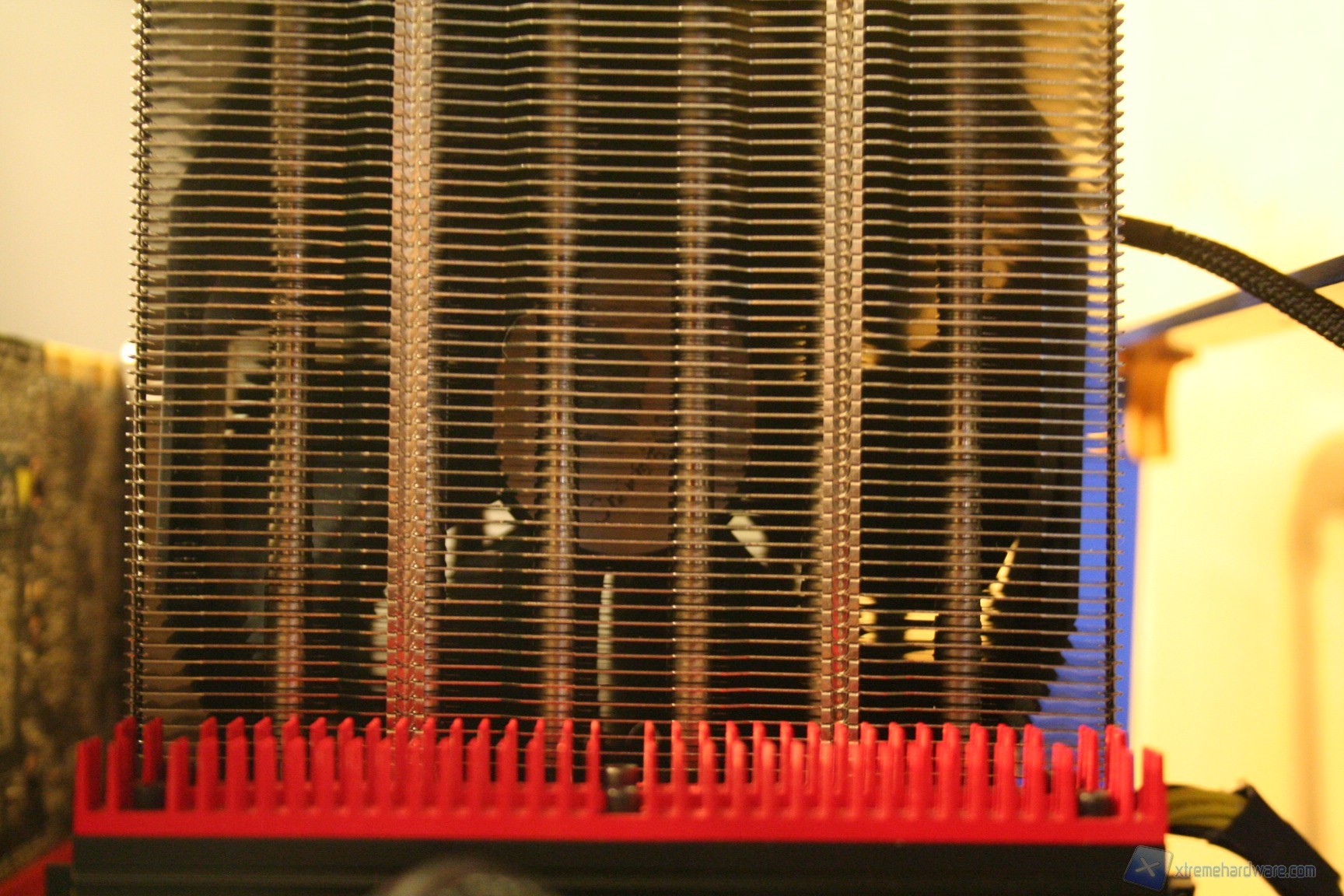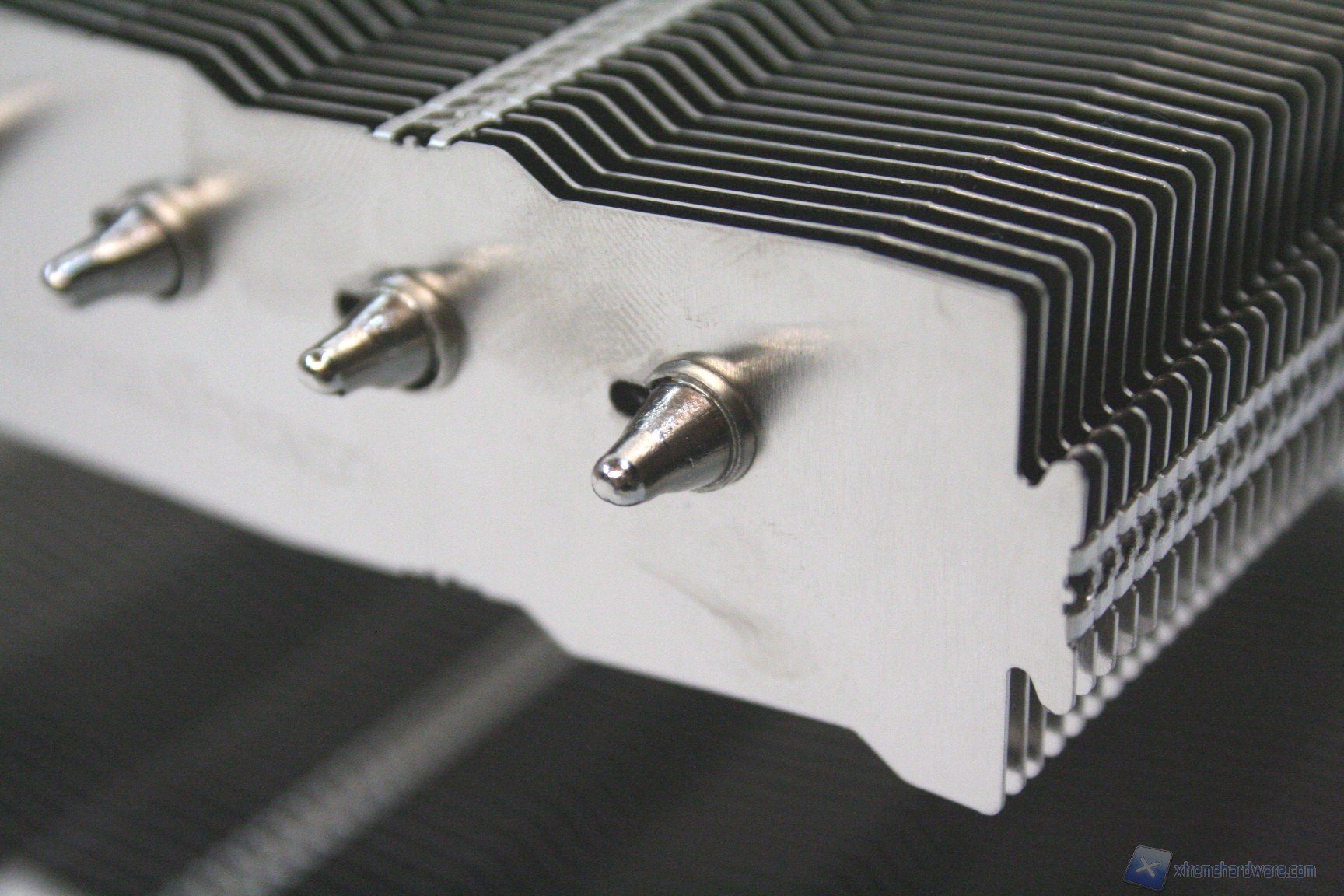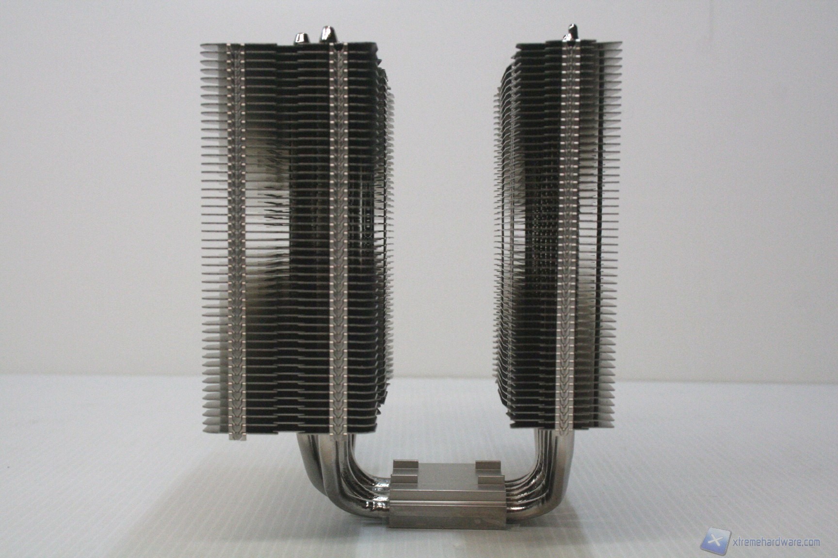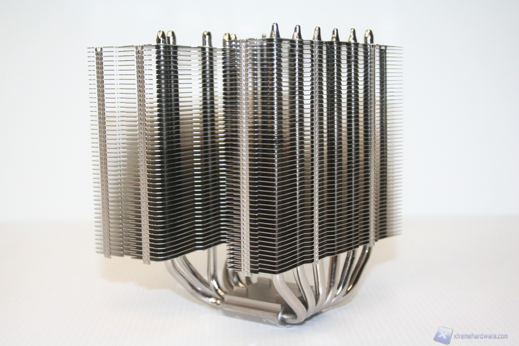 La struttura del corpo dissipante è molto avanzata e in parte ci ricorda il Thermalright Archon, il che è tutto dire sul design delle torri di raffreddamento. Presenta tutta una serie di ottimizzazioni per i flussi d’aria e l’ordinamento delle heatpipes è perfetto; la solidità strutturale è davvero molto elevata, lo spessore delle alette leggermente superiore alla media, 0.3mm, e la spaziatura intermedia, 1.8mm.