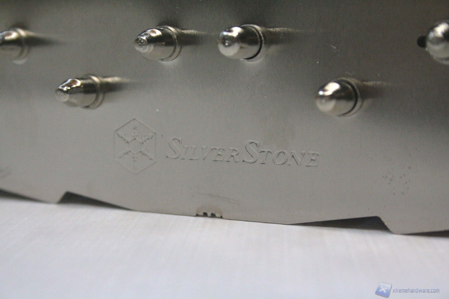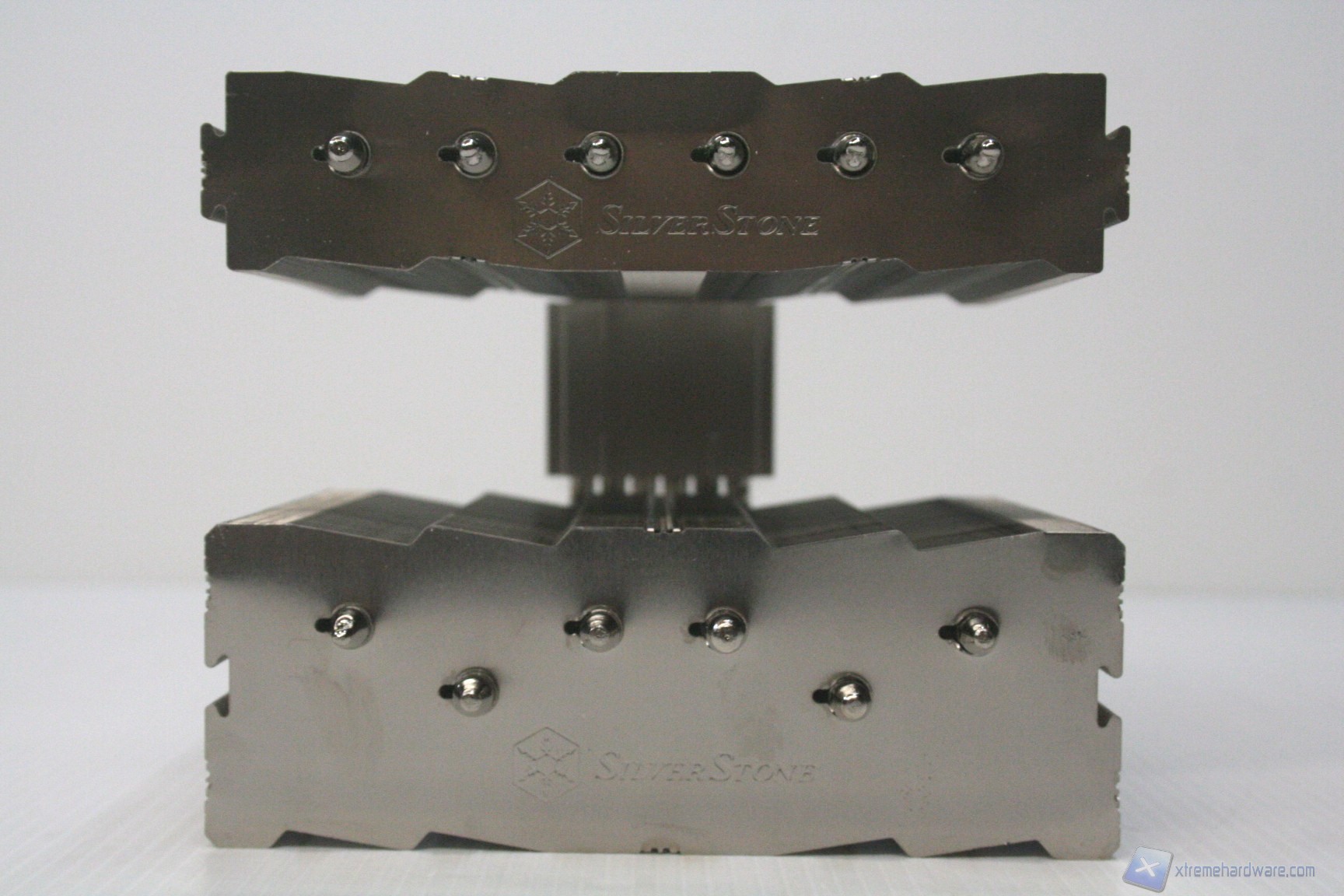 La struttura fa parte della classica tipologia a doppia torre di raffreddamento, costituita da due corpi dissipanti attraversati da 6 heatpipes ad “U”, distribuite uniformemente sull’intero volume ed aventi un diametro standard di 6mm. Al centro delle torri non è presente però nessuna rientranza, che per molti altri modelli della concorrenza è tipica (necessaria per migliorare il profilo di ventilazione interno in associazione alla zona morta di ventilazione, derivante dal diametro elevato del motore). Invece di un’introflessione, in questo caso c’è un profilo che tende leggermente verso l’esterno, scanalato verso le estremità sinistra e destra delle alette. La larghezza del dissipatore è importante, però Silverstone ha pensato bene di renderlo asimmetrico e garantire quindi la massima compatibilità per i banchi di RAM situati dinanzi alla prima torre. Questo permette una compatibilità massima con RAM ad elevato profilo su piattaforme non LGA 2011; in queste ultime sebbene non venga bloccato il primo slot frontale, ne vengono bloccati ben due posteriormente, per via dell’asimmetria delle torri di raffreddamento. La finitura è interamente in nichel e la struttura è rigidissima. La base inoltre risulta quasi completamente piatta, “quasi” perché è presente una microscopica convessità centrale.