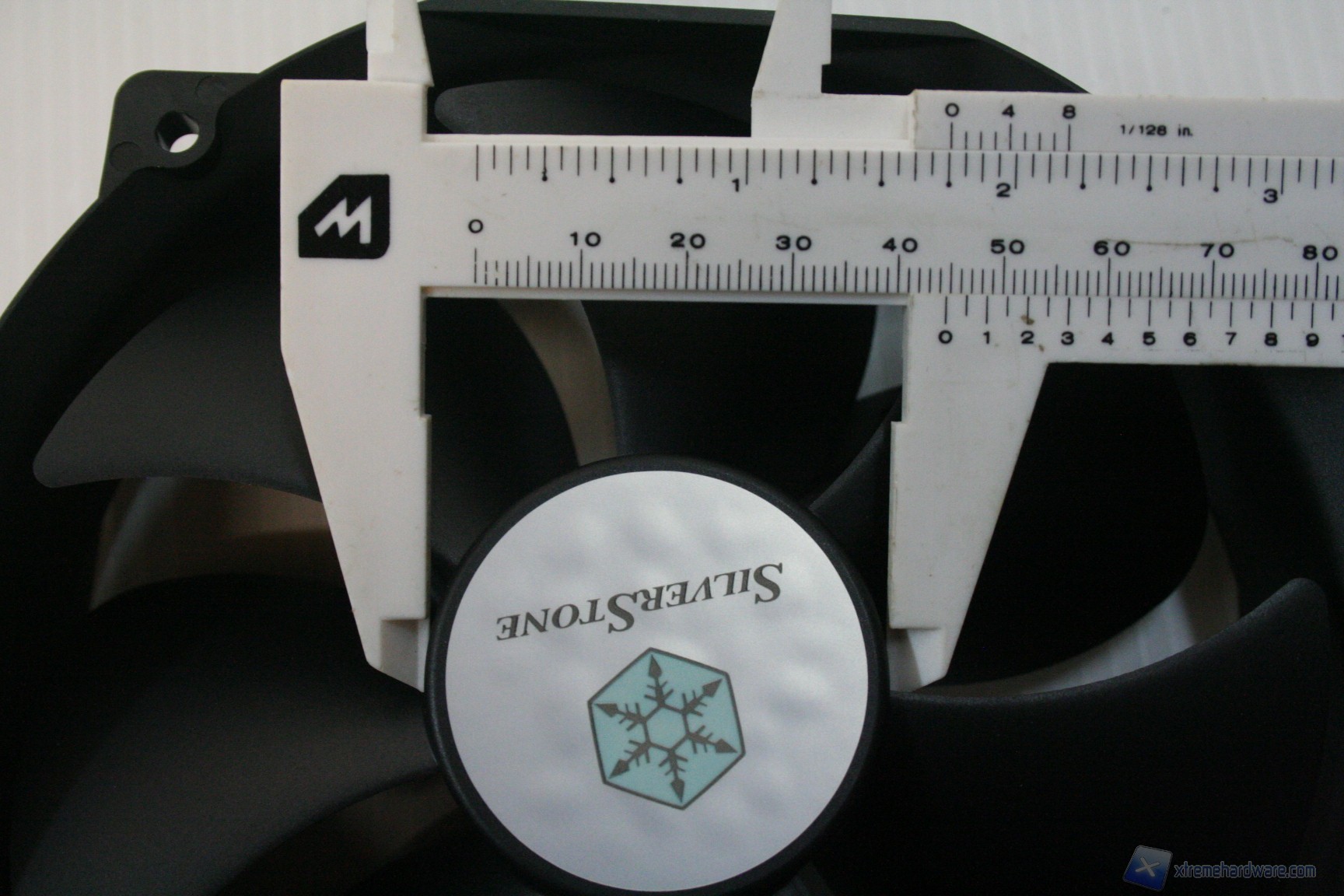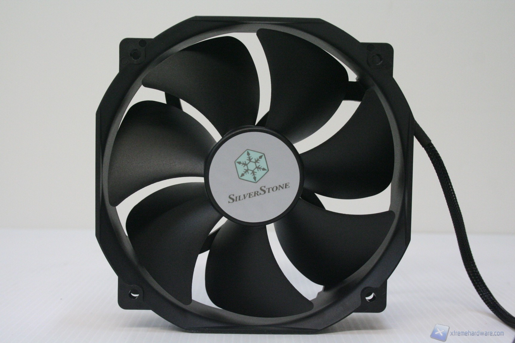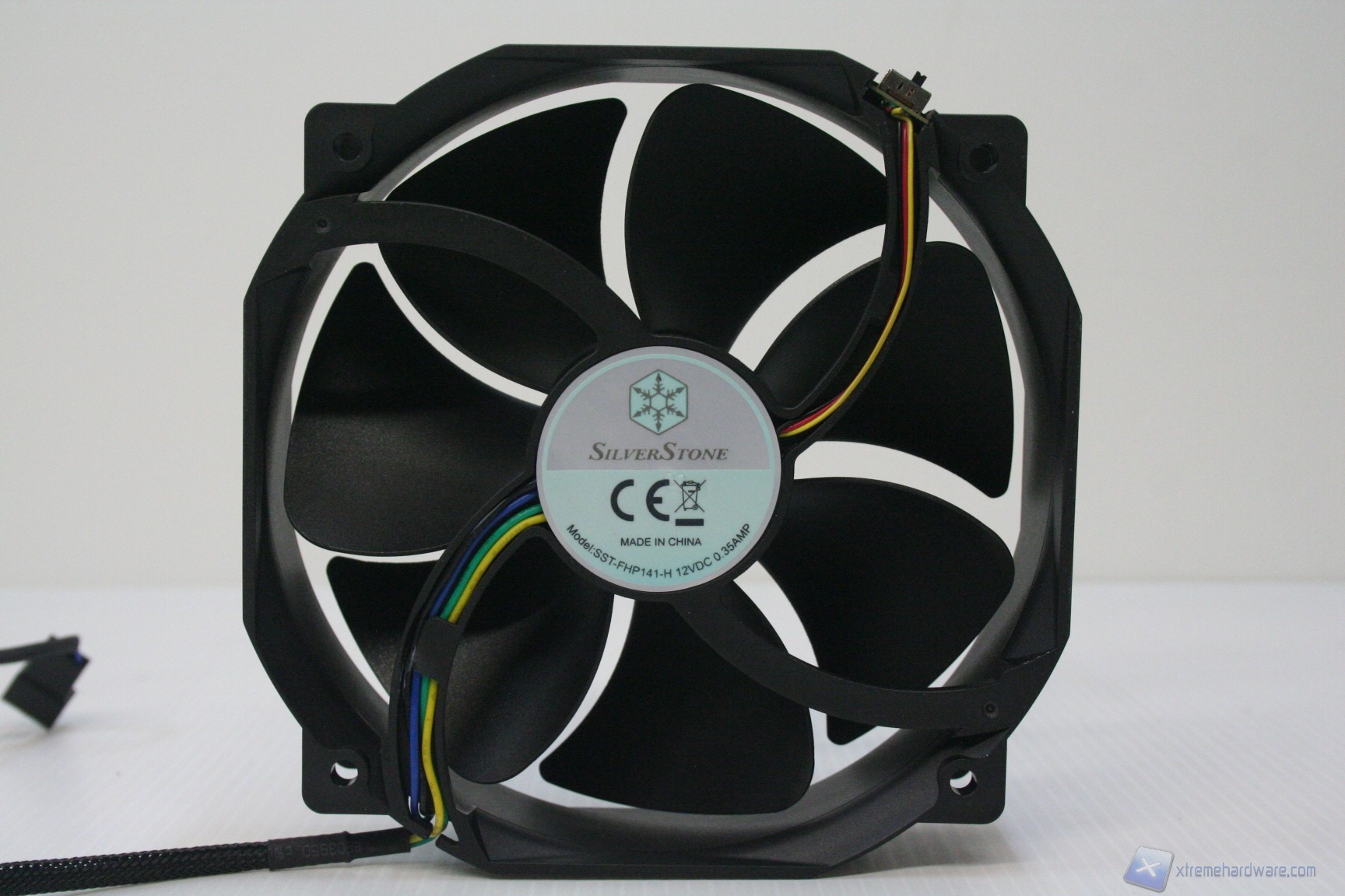 E’ presente il modello SST-FHP141-H. I dati di targa potete trovarli nel capitolo delle specifiche tecniche ma sappiate che è un modello davvero molto elaborato, dotato di uno switch per il funzionamento in due set di RPM, oltre al fatto che presenta uno spessore maggiorato e quindi permetterà di risparmiare spazio a causa dell’assenza di una ventola anteriore. Il dissipatore è stato studiato in funzione di questa ventola centrale ed è interessante notare che rappresenta un’assoluta novità rispetto a soluzioni concorrenti. La costante ricerca di Silverstone verso soluzioni tecnicamente e strutturalmente all’avanguardia ha permesso a questo modello di trovare una nicchia peculiare. La ventola è regolabile tramite uno switch posteriore e quindi è possibile settarla sia a 1100 RPM che 2000, il che ne aumenterà sia la poliedricità che la funzionalità, e quindi permetterà anche una discreta silenziosità in esercizio. E’ inutile far presente comunque che al massimo dei giri sarà molto rumorosa, vi invitiamo a fare riferimento alla tabella dei valori in dBA nella tabella dei test termici. Le performance sono molto elevate, e per una ventola da 171CFM teorici non poteva che essere altrimenti. Lo sleeving è eccellente, la ventola è PWM ed è anche presente uno sdoppiatore terminale, per permettere il controllo di una seconda ventola PWM.