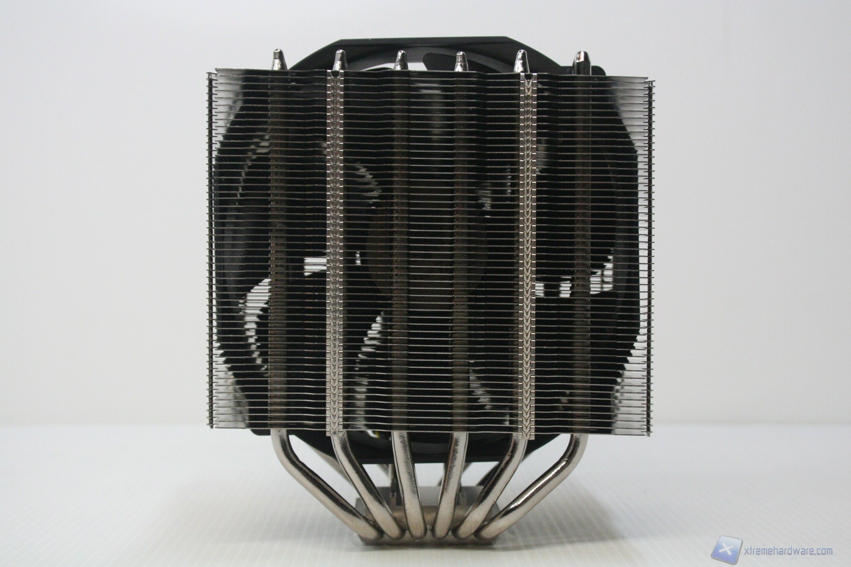 La scudatura finale delle heatpipes è anch’essa nichelata e presenta sia porzioni terminali bombate, sia nude; le heatpipes sono saldate sulle alette e la finitura è molto buona. Presenta una configurazione stock in configurazione push con una ventola da 140x38mm centrale ma è possibile aggiungerne una seconda posteriormente ed una terza anteriormente, quindi si ha a disposizione una soluzione modulare in base alle vostre necessità, ma precisiamo che comunque anche nella configurazione stock si hanno performance molto elevate. La superficie dissipante è elevata e preannunciamo che sarà in grado di gestire CPU decisamente potenti, quindi risulta un eccellente modello anche per CPU dal consumo più contenuto.