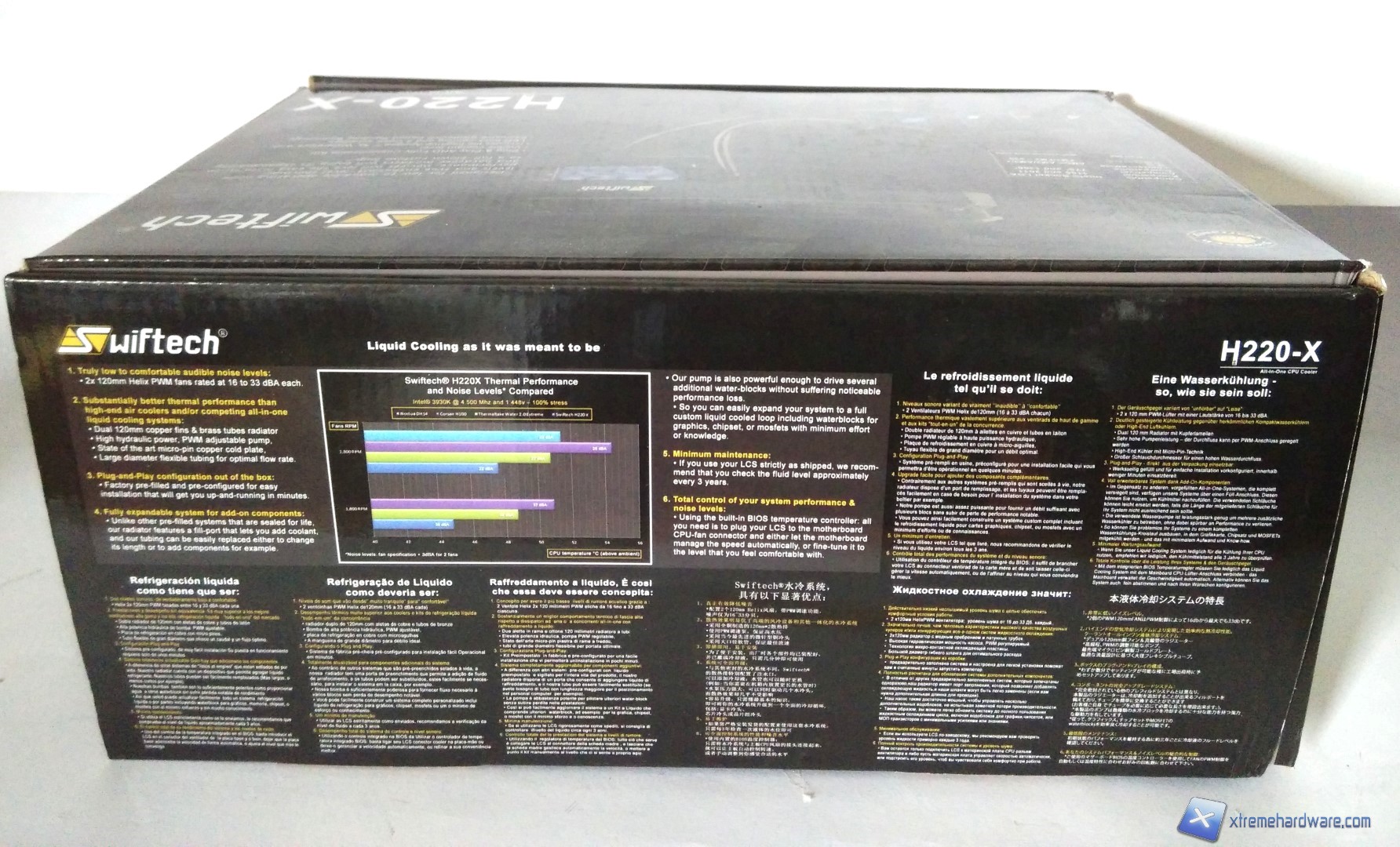 Sul retro troviamo le specifiche tecniche in 9 tabelle per le diverse lingue e accanto il disegno tecnico dell’AIO. Su un lato corto troviamo poi ulteriori informazioni sul kit (sempre in ben 9 lingue) e un grafico che ne mostra le prestazioni. Sull’altro lato invece un grande logo Swiftech H220-X
