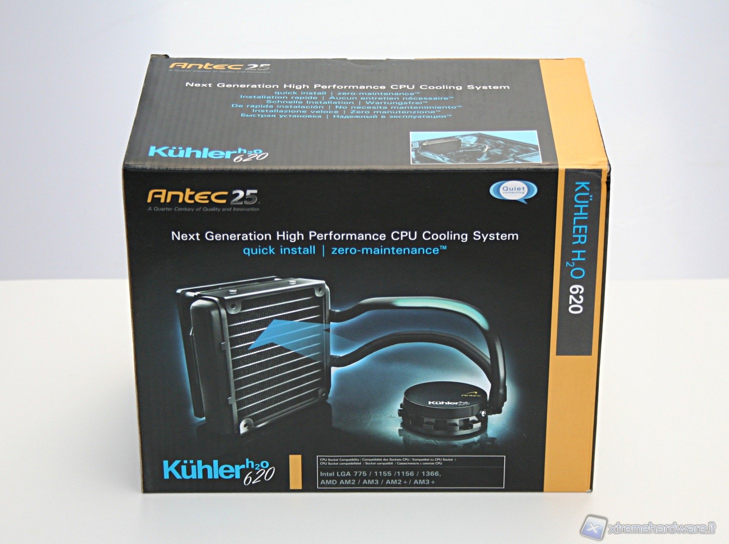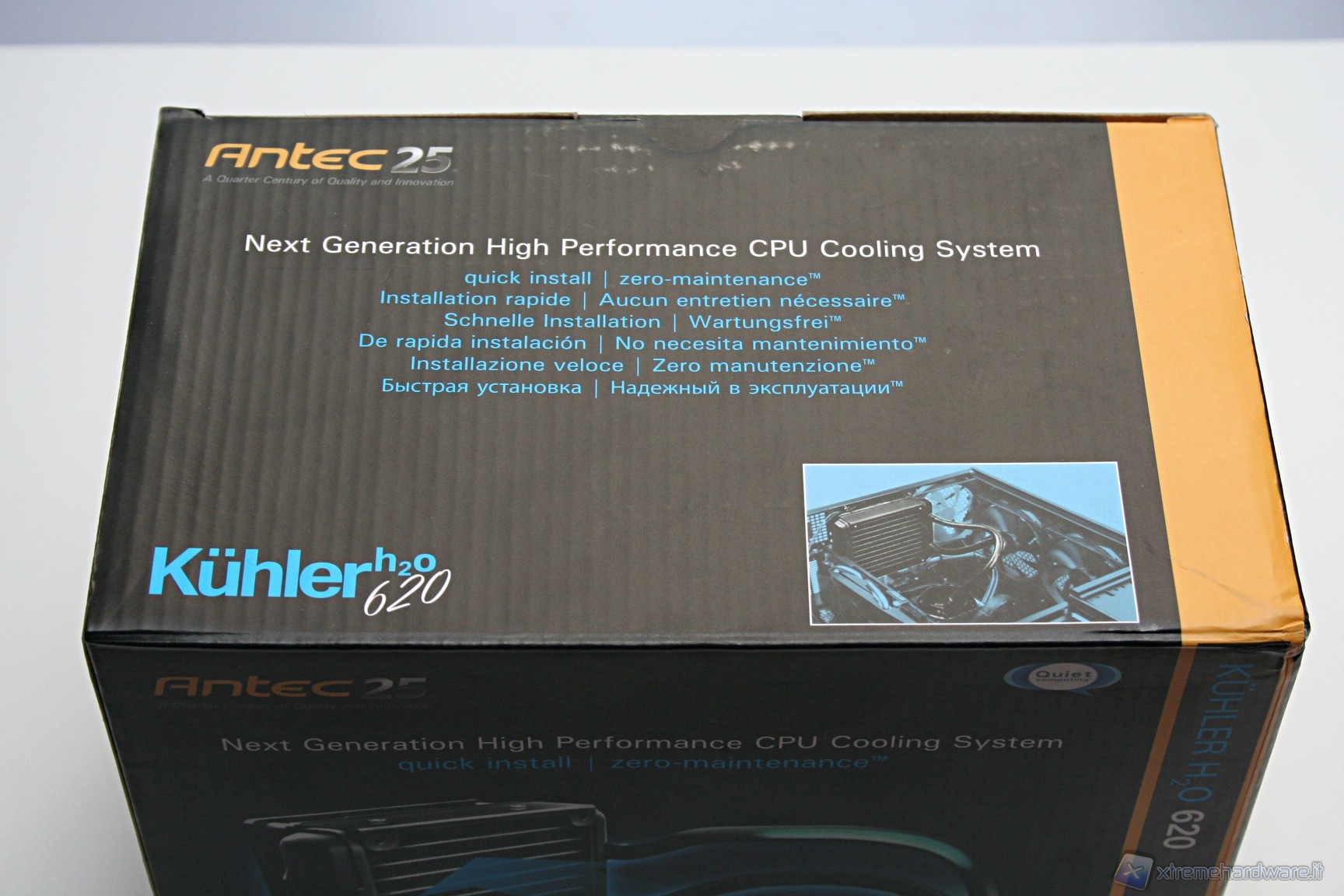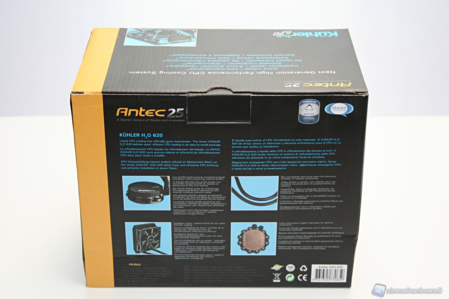 Il dissipatore, diversamente da altre soluzioni della concorrenza, è racchiuso in un particolare confezionamento derivante da sostanze riciclate, similmente a soluzioni di proprietà Sapphire. Ciò rende possibile ovviare in parte ai seri problemi derivanti dagli imballi di prodotti informatici, che per la loro natura inquinante sono problematici nello smaltimento. Tra gli obiettivi principali di Antec troviamo, infatti, il rispetto per l’ambiente. La scatola esterna, di forma rettangolare, è molto rigida ed all’esterno sono riportate tutte le informazioni necessarie, persino dei test specifici realizzati su una CPU Core i7 980.