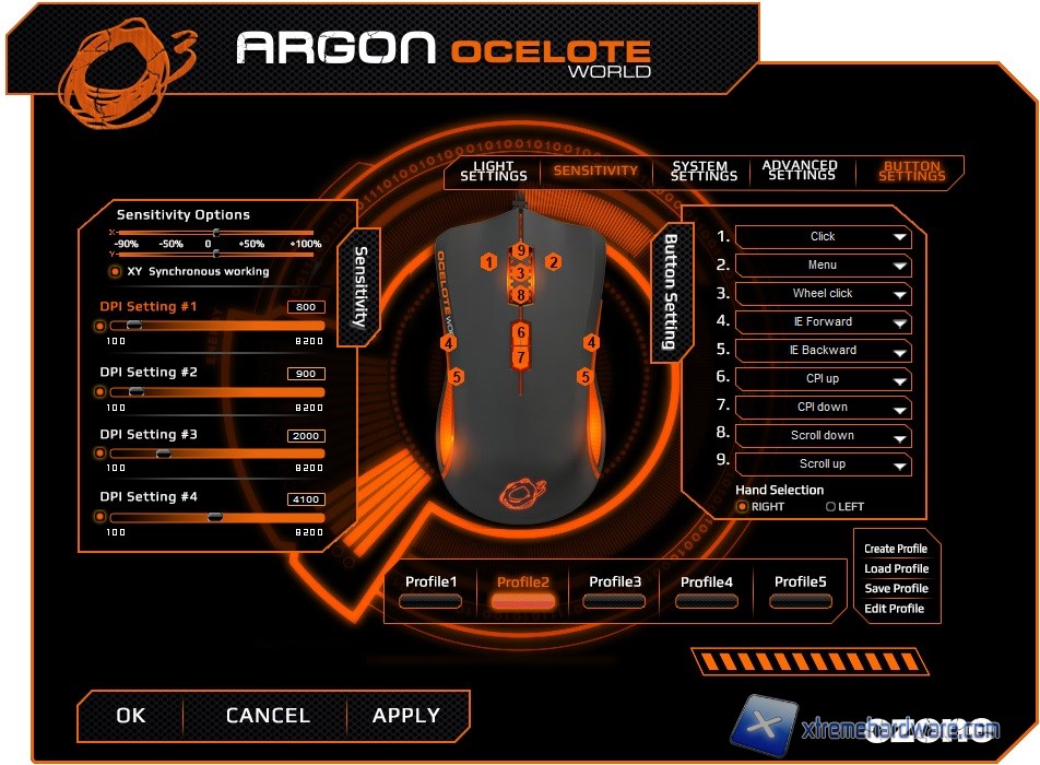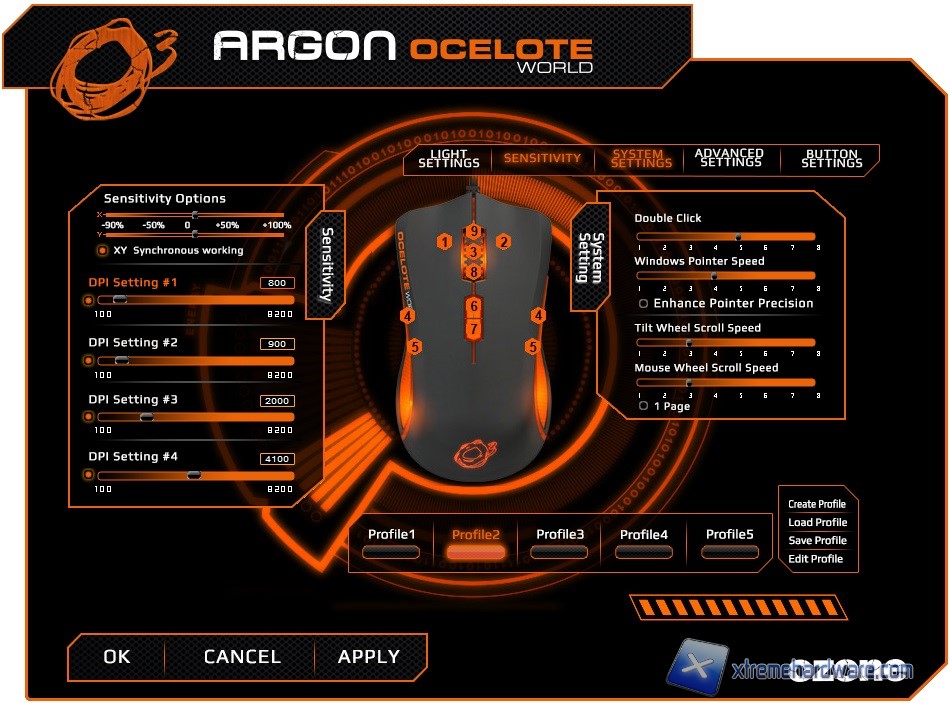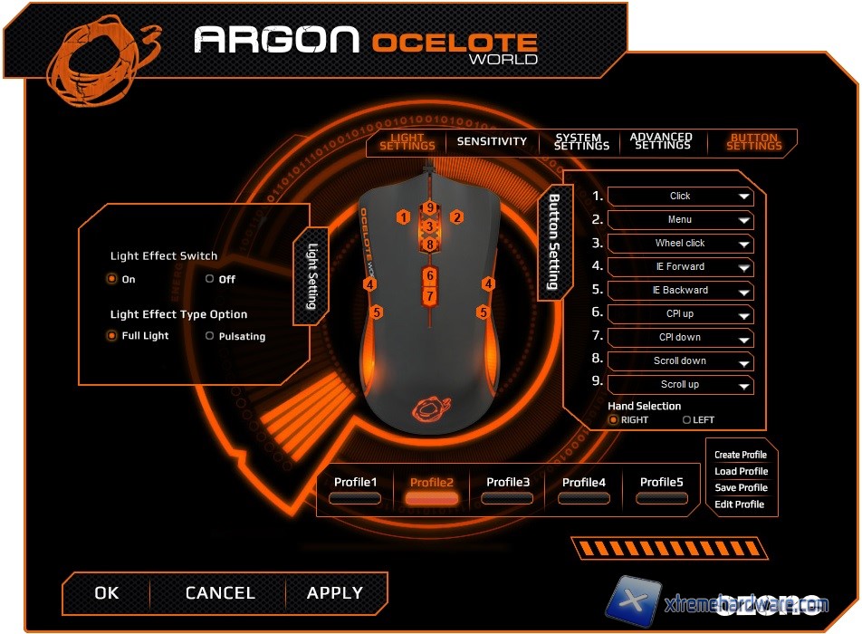 Come tutti i software di gestione anche in questo potremo editare, creare, salvare o cancellare i profili per un totale massimo di 5 profili salvabili nella memoria on-board di 128KB dell’Ozone Argon Ocelote World.