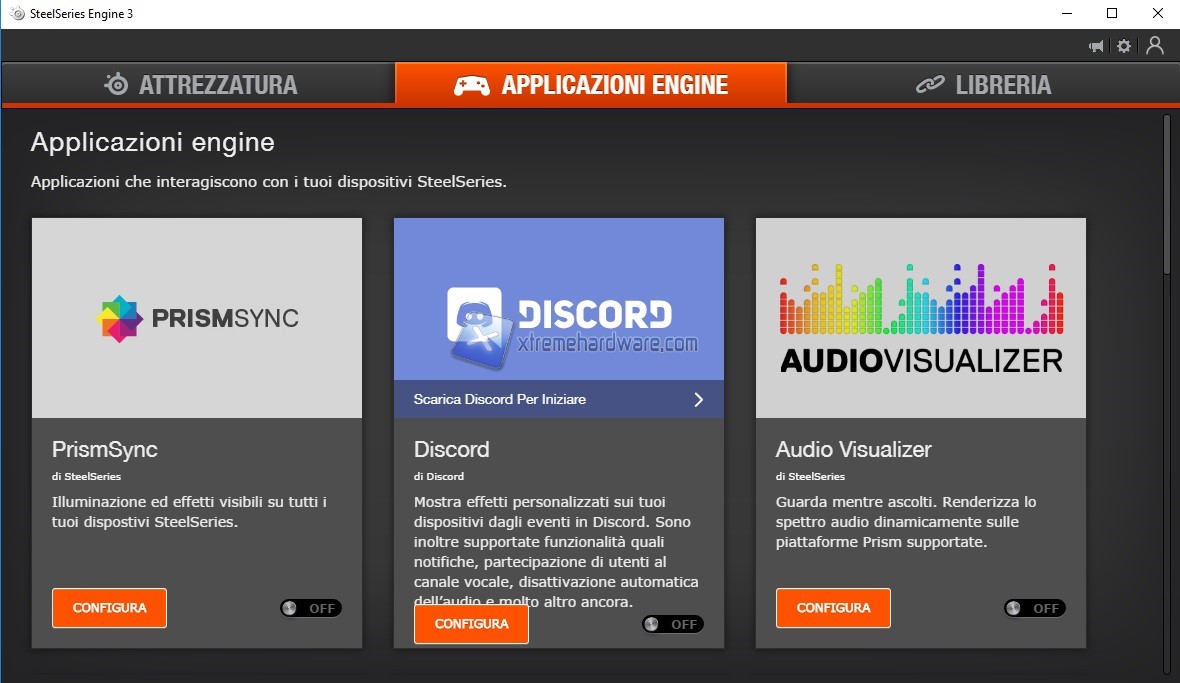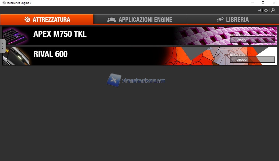 Siamo passati dunque ad installare l’oramai famoso software di gestione SteelSeries Engine 3. Al solito il software presenta una GUI molto pulita e semplice. Troviamo sempre tre Menù principali che sono ‘’Attrezzattura’’, ‘’Applicazioni Engine’’ e ‘’Libreria’’. Diamo dunque un veloce sguardo ad ogni singolo Menù.