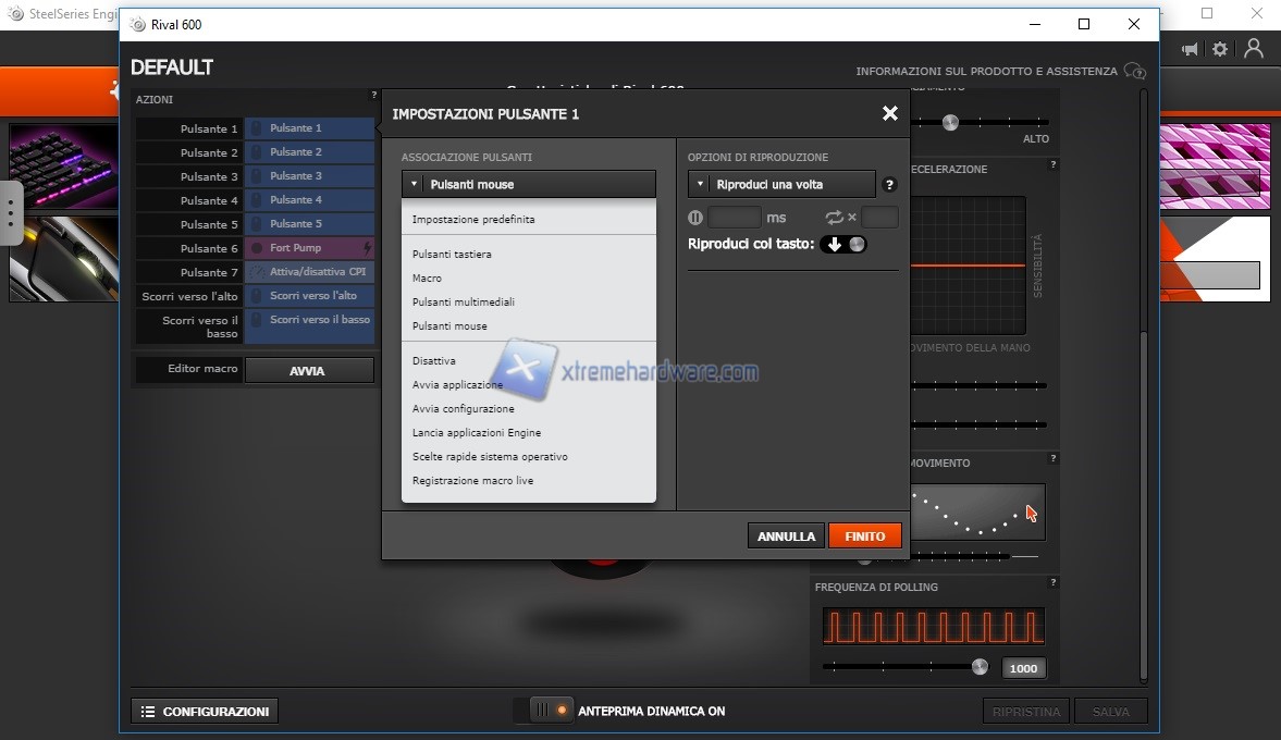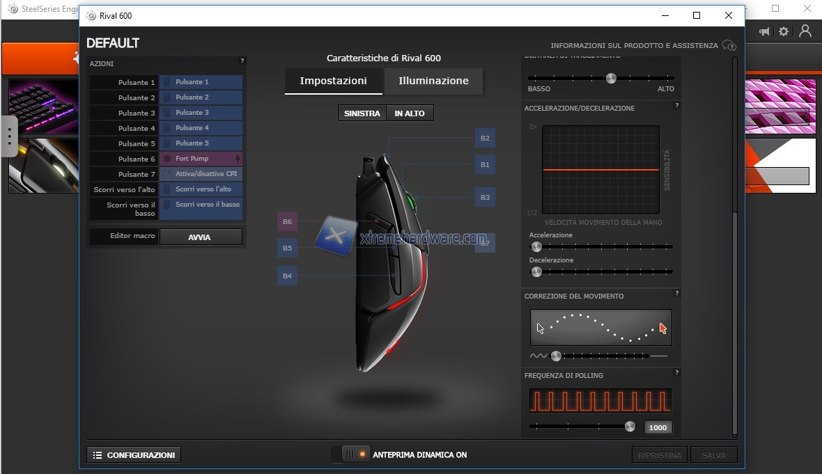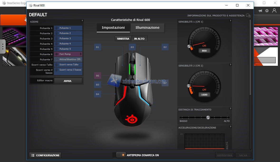 In ‘’Attrezzattura’’ visualizzerete tutte le periferiche SteelSeries compatibili con il software. In questo caso abbiamo collegato la tastiera SteelSeries Apex M750 TKL e ovviamente il mouse SteelSeries Rival 600. Facendo doppio click sul rettangolo relativo la periferica si aprirà una seconda finestra nella quale avremo un’immagine del mouse, in questo caso, contornata da ulteriori voci e Menù che ci daranno la possibilità di personalizzare non solo l’illuminazione RGB per singolo tasto ma anche di assegnare e personalizzare i tasti del mouse con funzioni nuove o Macro grazie anche all’Editor a lato sinistro o ancora modificare il Polling Rate e la voce più importante modificare il valore di LOD (Distanza di tracciamento).