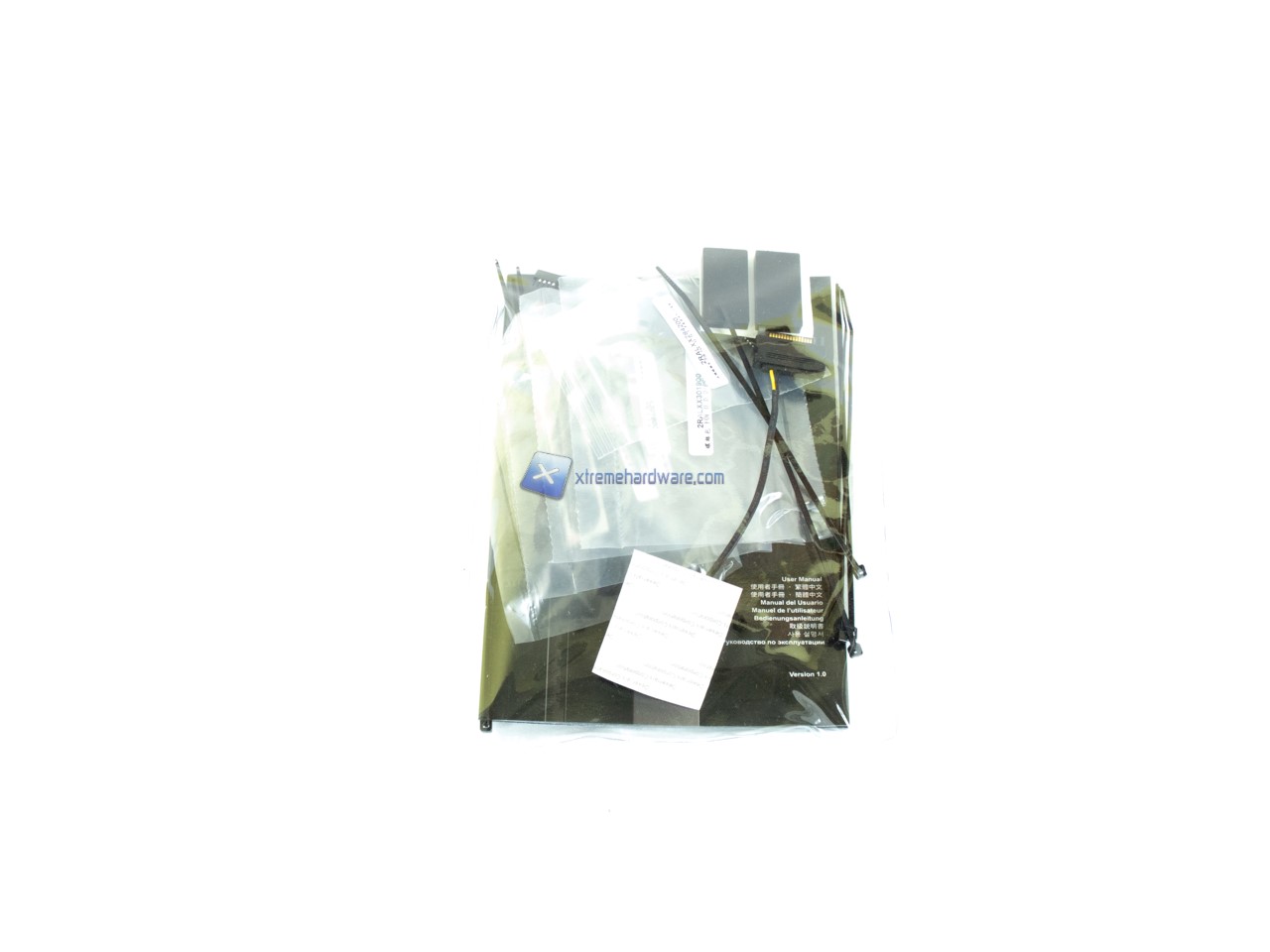Aperta la confezione troveremo sempre il case ben fermo da otto angolari in polistirolo e protetto da una sacca in tessuto di colore nero.