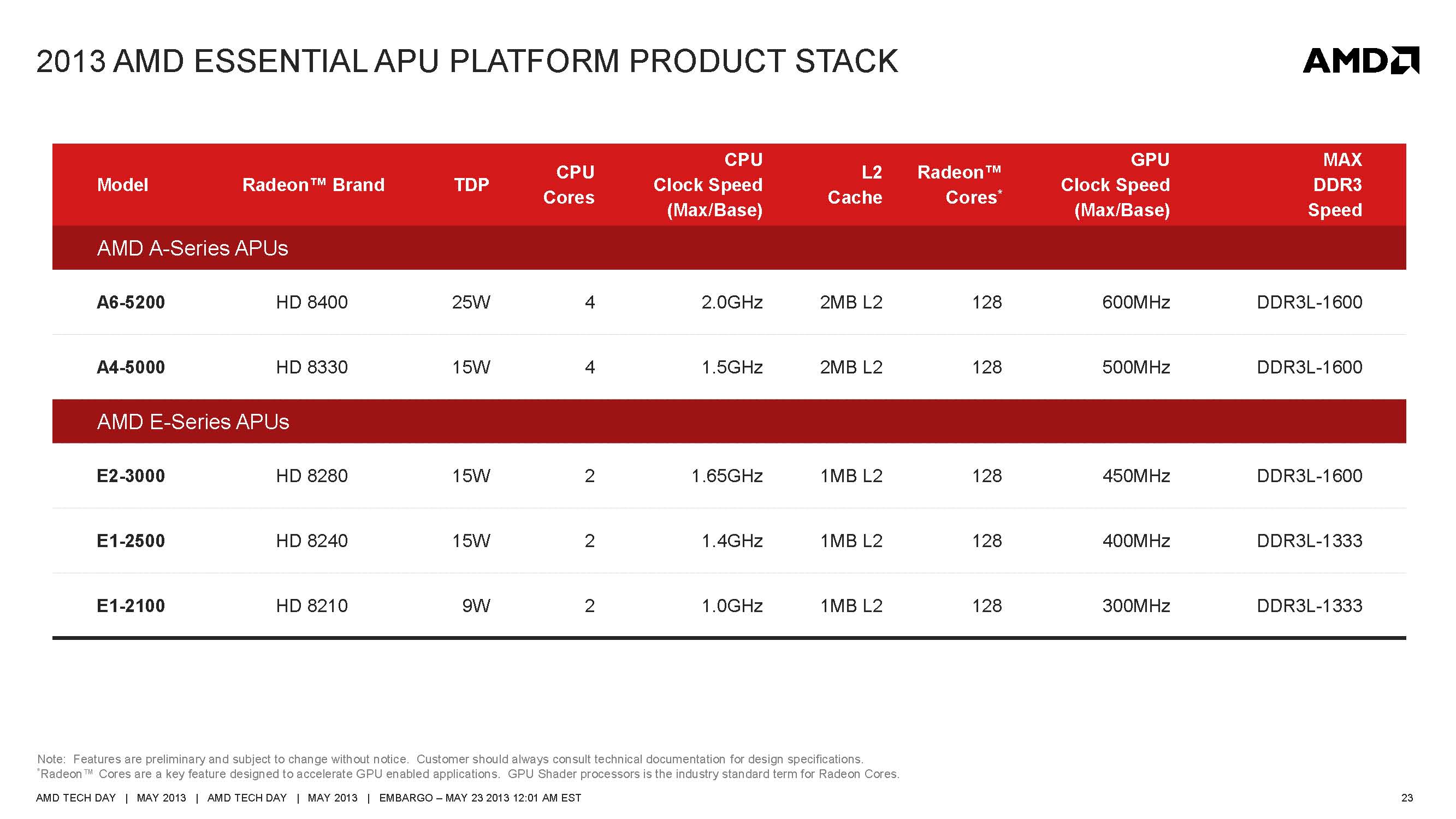 I modelli per questo settore sono ben cinque: abbiamo i modelli serie E ed i modelli serie A. I modelli serie E sono tutti Dual Core con un TDP variabile da 9 Watt fino a 15 Watt a seconda del modello: E1-2100, E1-2500 e E2-3000. Questi modeli si differenziano per frequenze operative della CPU che partono per il modello base da 1.0 GHz fino ad arrivare per il modello E2-3000 a 1.65 GHz. Il core grafico è sempre il chip Radeon HD 8200 che varia soltanto la frequenza operativa; 300 MHz per il modelo base E1-2100 e fino a 400 MHz per gli altri due modelli. Il supporto per la memoria prevede un massimo di DDR3L-1600 per il modello E2-3000 mentre per gli altri due si prevede la tipologia DDR3L-1333.