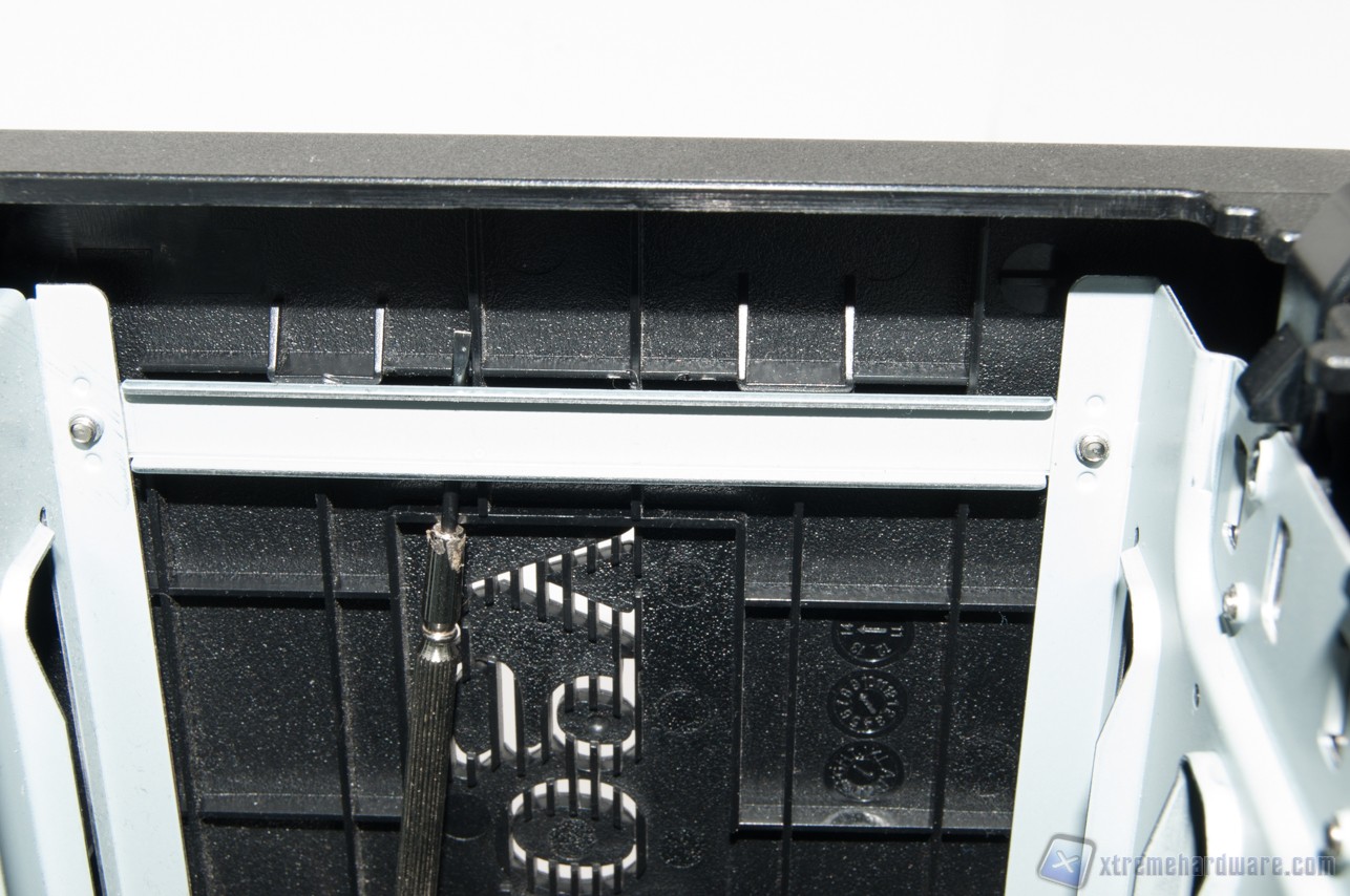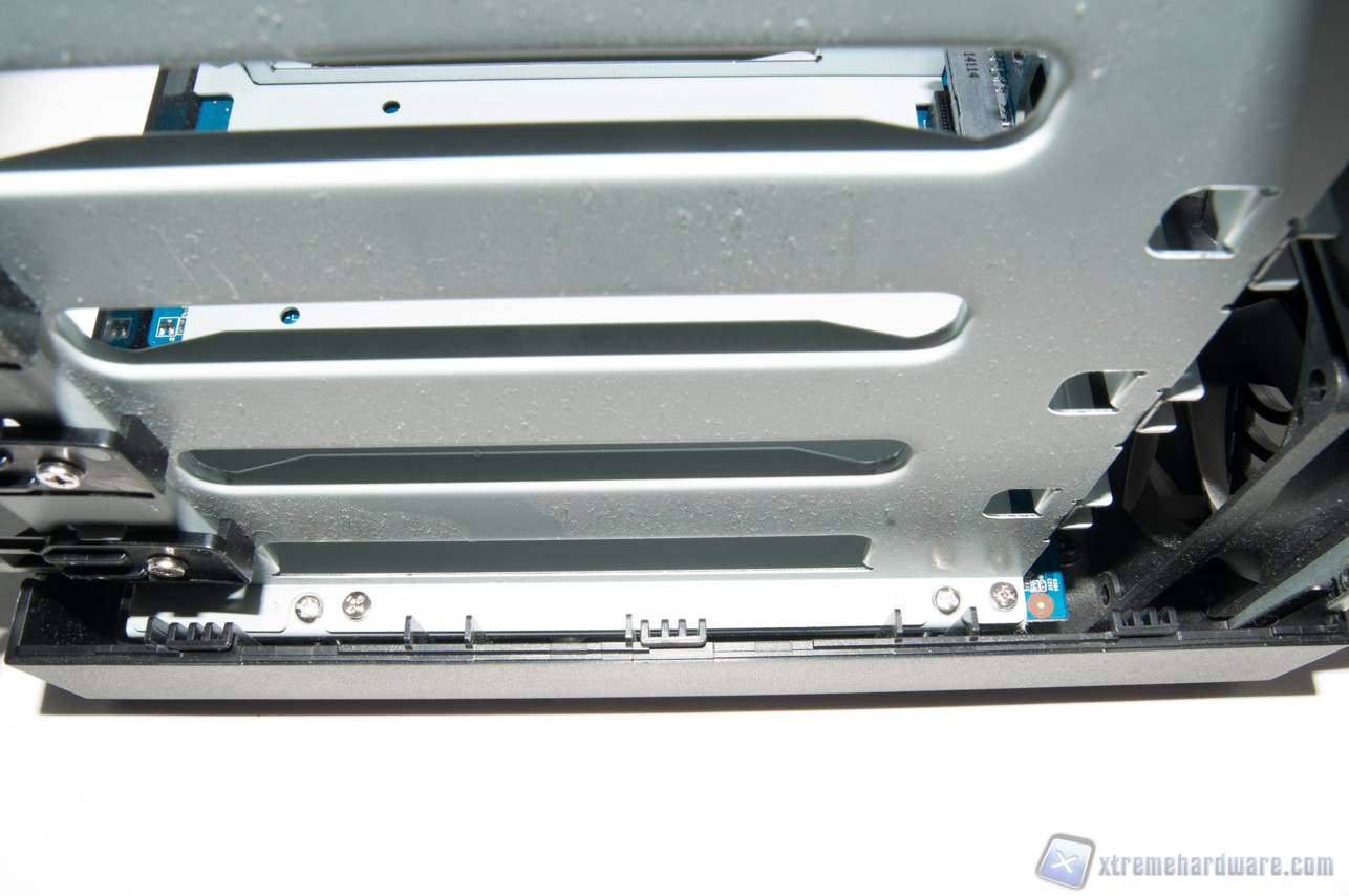 All'interno del vano dischi notiamo, lungo il bordo del sistema, due clip in plastica ancorate ad una staffa di metallo.